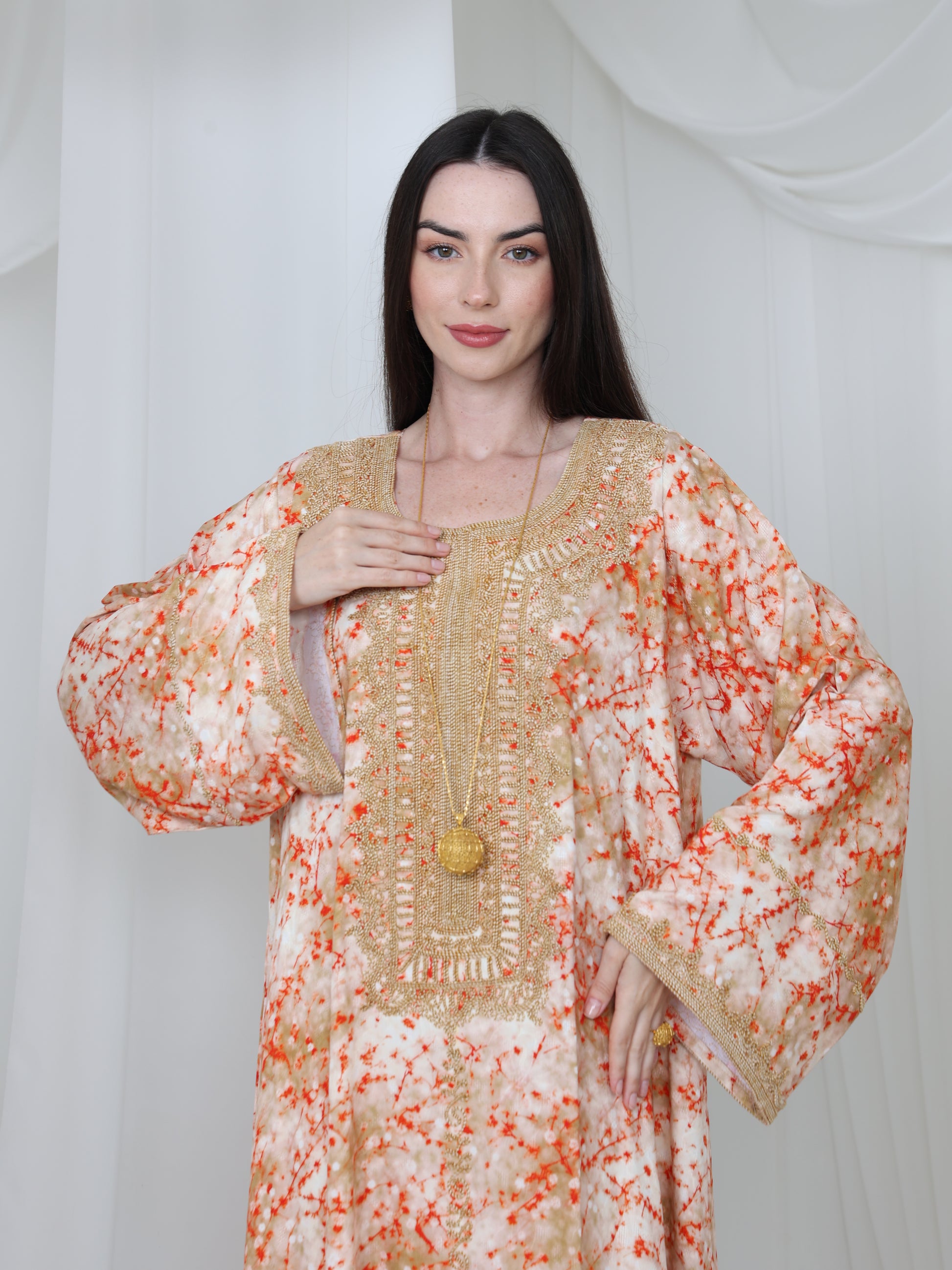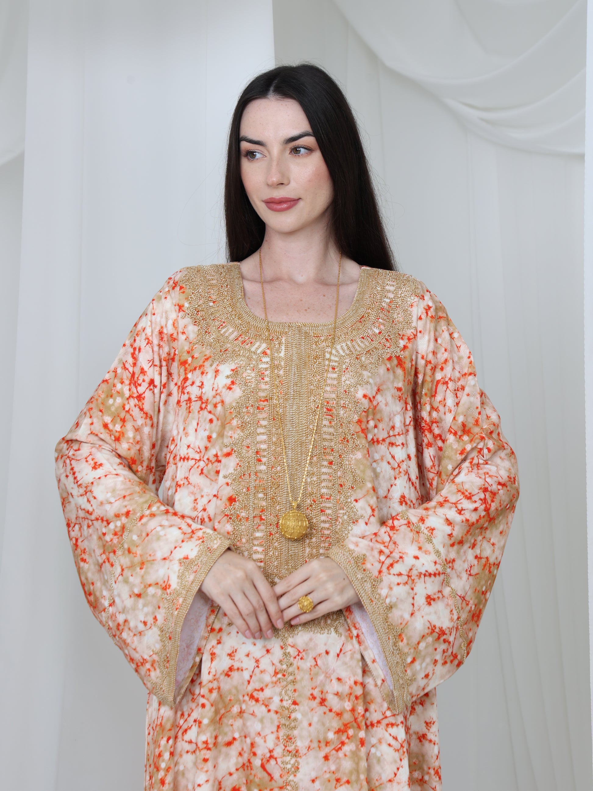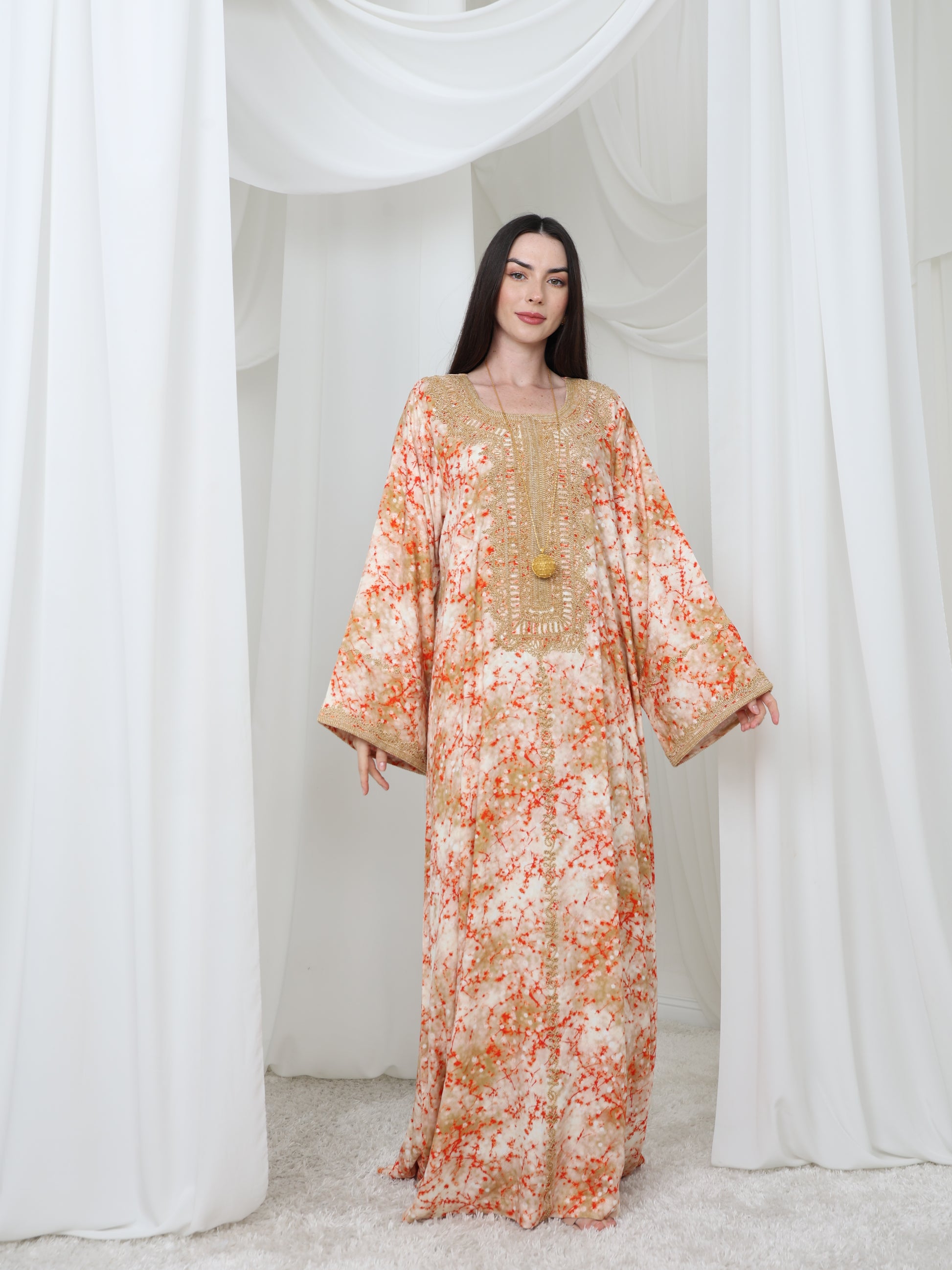 The Sunrise Coral Kaftan radiates warmth with its delicate floral pattern in soft coral and cream tones. Intricately embellished with golden embroidery at the V-neckline, this piece brings together traditional craftsmanship and contemporary design. The flowing silhouette and bell sleeves create a graceful effect with every movement. Paired with the matching pendant, this kaftan offers a complete look ready for garden parties, brunch gatherings, or elegant resort wear. This one-size-fits-all kaftan measures 23 inches across the chest and 58 inches in length. Complimentary alterations are offered.